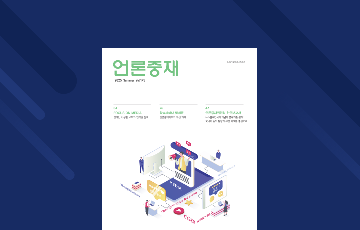 위원회가 계간 「언론중재」 2025년 여름호를 발간했습니다. 이번 계간지에서는 ‘연예인 사생활 보도와 인격권 침해’를 주제로 한 <사이버 레커 유튜버의 활약과 언론의 기생>, <연예인 프라이버시와 알 권리 사이>가 실렸습니다. 특히, 이번 호에는 위원회가 연구 역량 강화 차원에서 설립한 연구센터가 발간한 현안보고서 <뉴스플루언서의 개념과 분류기준 분석: 국내외 논의 동향과 유럽 사례를 중심으로>가 수록되었습니다. 이 밖에도 주목할 만한 해외언론법제 및 국내 판례 소개 등 다양한 미디어 이슈를 다룬 글들이 함께 실렸습니다.