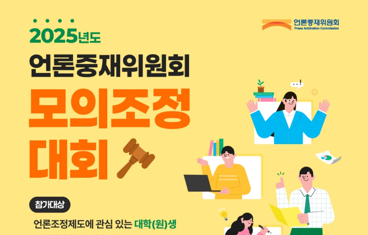 위원회가 언론조정제도에 관심 있는 대학(원)생을 대상으로 모의조정대회를 개최합니다. 이번 모의조정대회의 참가 접수는 7월 20일(일)까지이며, 팀 단위(3~5명)로 참가 신청을 받습니다. 참가자들은 사전교육을 이수한 후 모의조정 시나리오를 제출하게 되며, 시나리오 사전심사를 거쳐 선발된 상위 3개 팀은 9월 25일(목) 모의조정 경연을 통해 금·은·동상을 가리게 됩니다. 상금 규모는 총 600만원이며, 일정 및 심사기준 등 자세한 내용은 위원회 홈페이지(www.pac.or.kr)를 참고하시기 바랍니다.