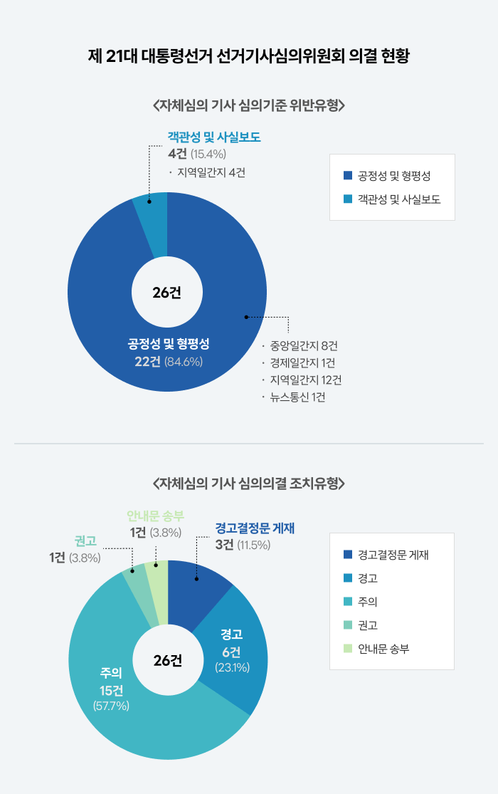 제21대 대선 선거기사심의위원회(이하 “선심위”)가 7월 3일 활동을 마쳤습니다. 지난 4월 14일부터 약 3개월간 운영된 이번 선심위는 운영 기간동안 자체심의 안건 총 26건에 대해 경고결정문 게재 3건, 경고 6건, 주의 15건, 권고 1건, 안내문 송부 1건 등을 심의·의결했습니다. 이번 선거에서는 생성형 AI를 활용한 새로운 유형의 선거보도가 처음으로 등장해 심의가 이루어졌습니다. 선심위는 관련 보도 중 챗GPT가 후보자의 자질을 평가한 결과를 그래프로 나타내면서 평가 기준과 방법을 전혀 제시하지 않은 보도에 대해 유권자의 판단 왜곡 우려를 이유로 경고결정문 게재 조치를 의결했습니다.