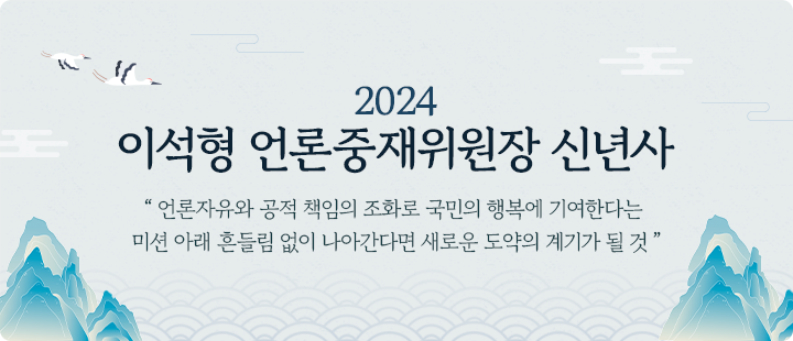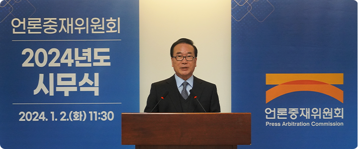 위원회는 갑진년 새해를 맞아 1월 2일 시무식을 개최했습니다. 이석형 위원장은 신년사에서 “급변하는 미디어환경 속에서 올바른 여론형성과 언론의 자유가 침해될 수 있다”면서 “‘언론자유와 공적 책임의 조화로 국민의 행복에 기여한다’는 미션 아래 흔들림 없이 나아간다면 새로운 도약의 계기가 될 것”이라고 강조했습니다. 이날 문한식(서울제4중재부), 최승재(서울제8중재부), 방명균(강원중재부) 중재위원 및 김문성 예산회계팀장과 오윤미 조사팀 차장이 미디어산업 발전에 기여한 공로를 인정받아 문화체육관광부 표창을 수상했습니다.