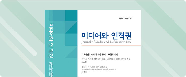 이번 학술지에는 ‘미디어 내용 규제와 표현의 자유’를 주제로 한 기획논문 2편이 수록되었습니다. 양소연 헌법재판소 헌법연구관은 ‘표현의 자유를 제한하는 광고 실증제도에 대한 비판적 검토’를, 심영섭 경희사이버대학교 미디어영상홍보 학과 겸임교수는 ‘미디어 콘텐츠에 대한 공동규제’를 제목으로, 미디어 내용에 대한 다양한 규제를 표현의 자유 관점에서 밀도 있게 분석했습니다.
